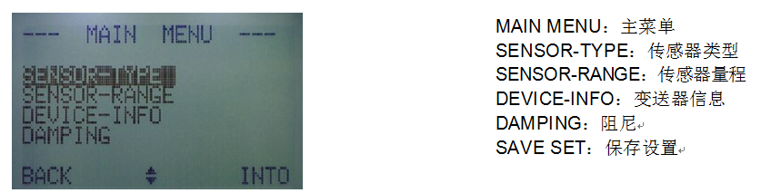 按鈕能夠進入 DEVICE-INFO(變送器信息)子菜單,能夠檢查變送器的裝備信息(普通環境下,用戶不須要進入此菜單)。