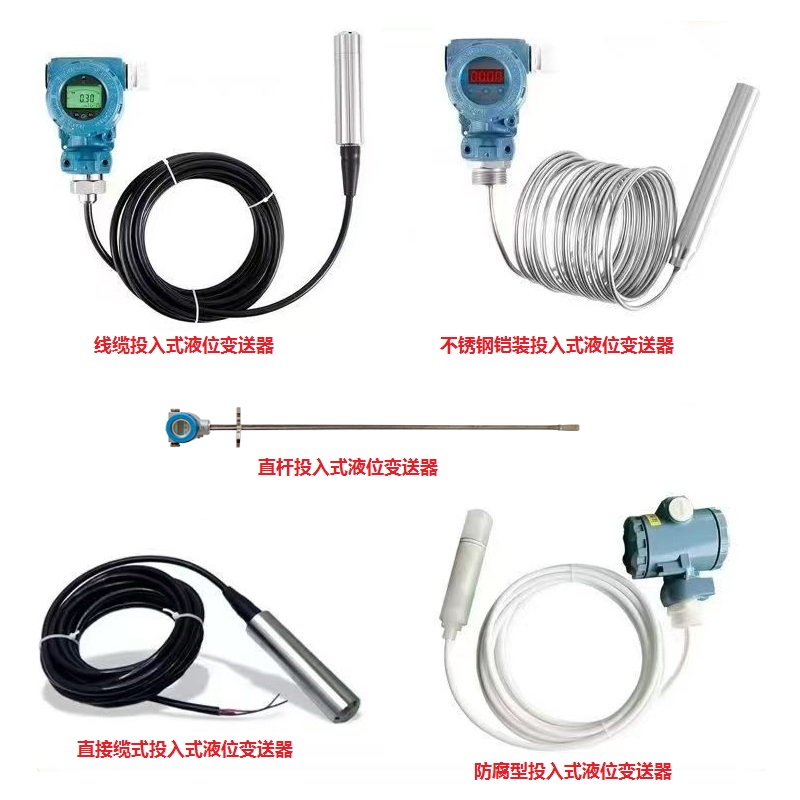 投入式液位變送器型式有線纜式投入式與直桿投入式,線纜投入式有通俗丁晴橡膠線纜、PP線纜、四氟均衡罩式、不銹鋼鎧裝式、間接投入引線式等等(見下圖)