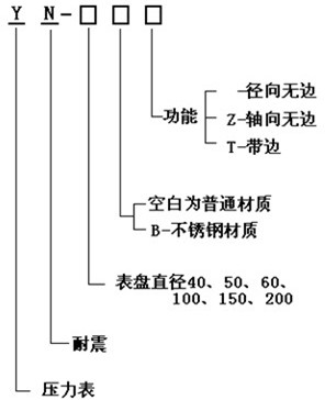 選型申明:功效選型中“T”僅合用于Φ60 Φ100 Φ150表盤的壓力表