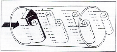 在流體中設置三角柱型漩渦產生體,則從漩渦產生體兩側瓜代地產生兩列有法則的漩渦,這類漩渦稱為卡門漩渦,以下圖所示,漩渦列在漩渦產生體下流非對稱地擺列。