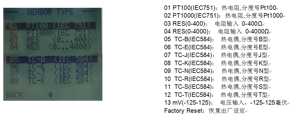 按鈕進入 SENSOR-TYPE(傳感器范例)子菜單,按